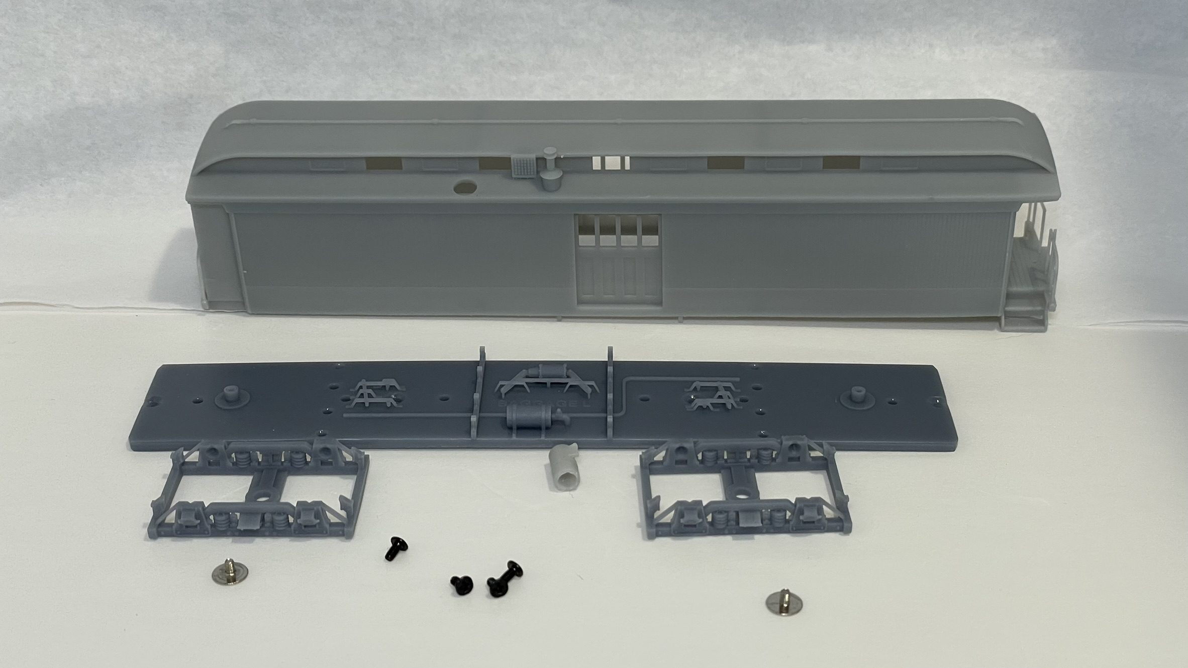 Kit for the DRGW Jackson & Sharp long baggage car modified with a generator for use on the San Juan and Shavano trains in 1936. Kit comes with body, underframe, truck frames, and needed screws. Requires tapping holes to M2, wheelsets, couplers, and window glazing.